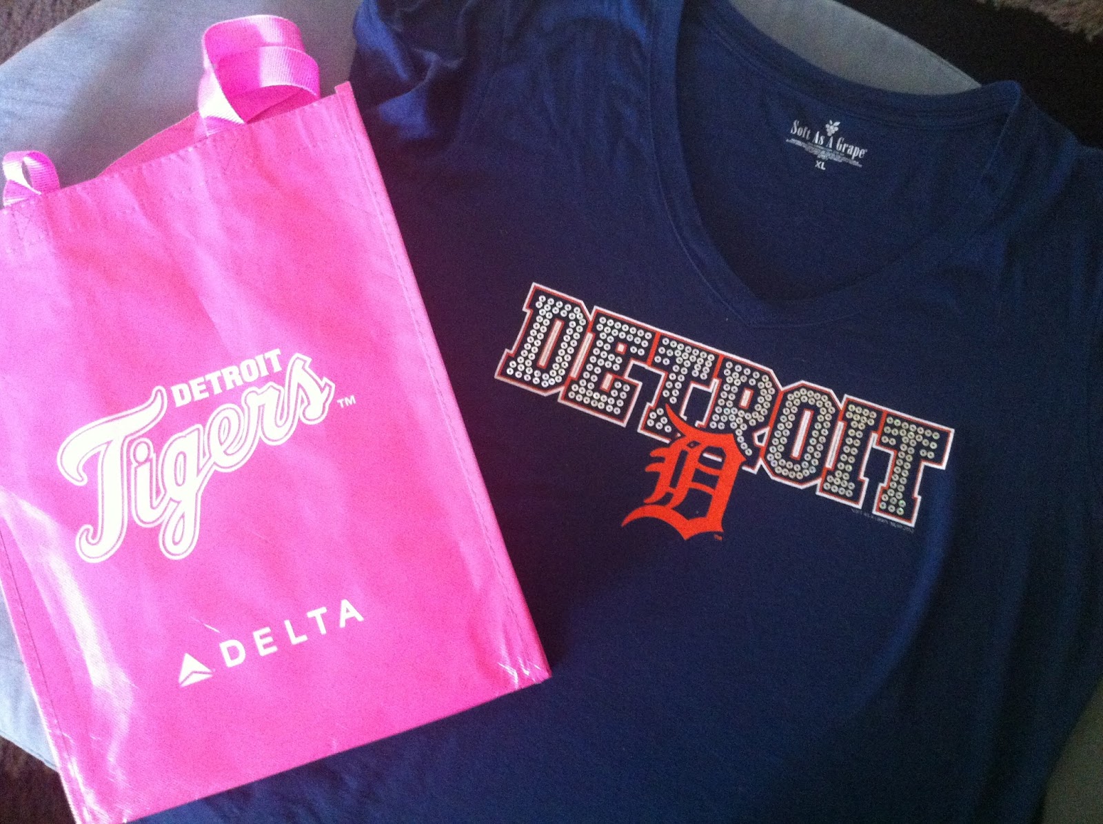 | This is the t-shirt I wore (although I had to cover it up with a sweatshirt because it was chilly!), and they gave away pink totes bags because it was Breast Cancer Awareness night. |