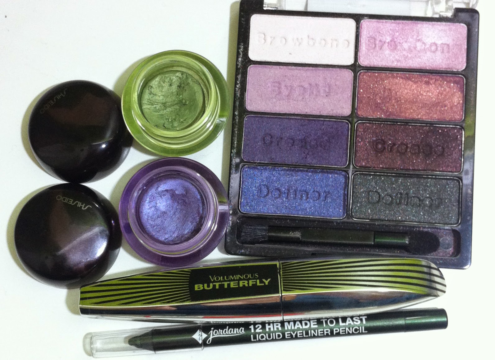 from left: Wet 'n' Wild Brulee, Wet 'n' Wild "crease" color from the Petal Pusher palette, Shiseido H6, Shiseido H7, Jordana eyeliner pencil in Jade Jewel |
